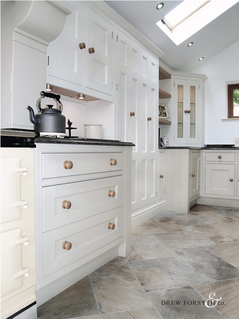 This large open plan kitchen dinner makes best use of the natural light. The beautifully angled island provides a great place to eat too.