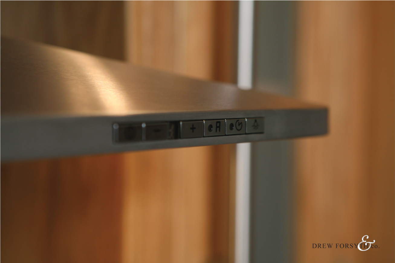 This sleek L-shape designed kitchen is made of solid oak. The built-in spotlights create a modern and stylish design.